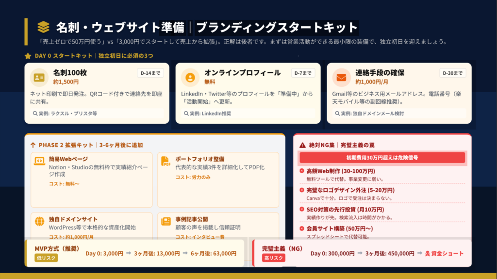 「売上ゼロで50万円使う」vs「3,000円でスタートして売上から拡張」。正解は後者です。まずは営業活動ができる最小限の装備で独立初日を迎えましょう。