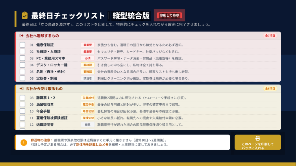最終日は「立つ鳥跡を濁さず」の精神で臨みましょう。このリストを印刷して、物理的にチェックを入れながら確実に完了させてください。