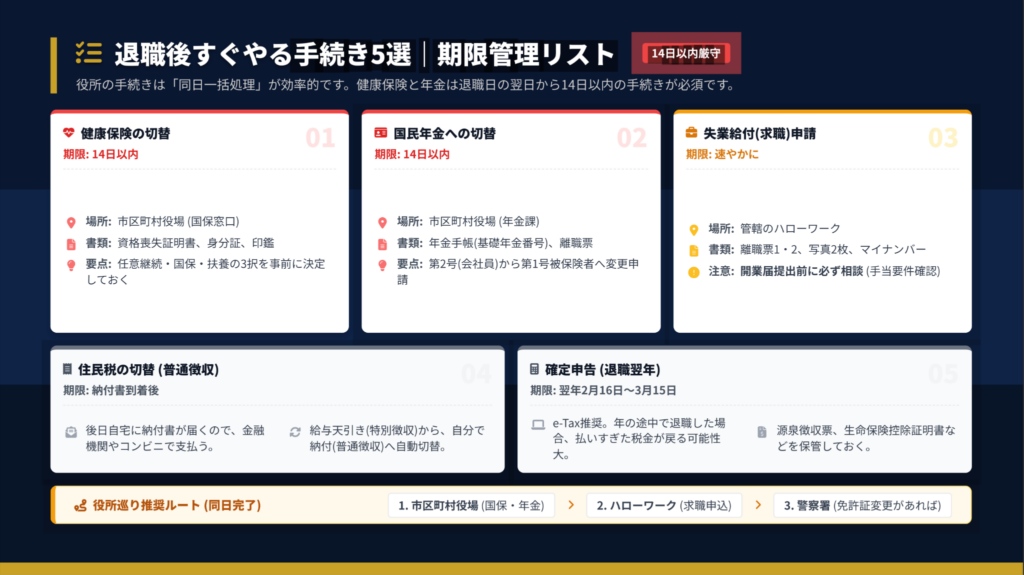 役所巡りの推奨ルートは「市区町村役場(国保・年金)→ハローワーク(求職申込)→警察署(免許証変更があれば)」の順で、同日完了を目指してください。