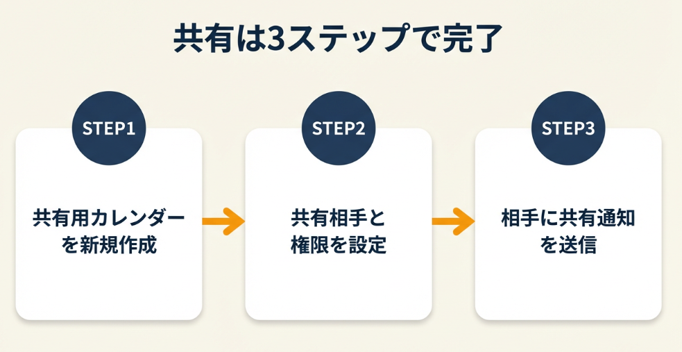 まず、共有専用のカレンダーを新規作成します。既存のカレンダーをそのまま共有すると、プライベートな予定まで見えてしまうリスクがあるため、共有用は別カレンダーにしてください。