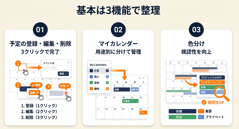 予定の登録・編集・削除は3クリックで完了