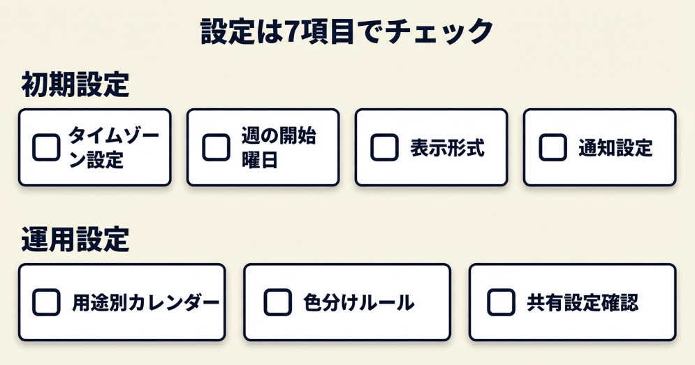 A. いいえ、最低限「タイムゾーン」「通知設定」「用途別カレンダー1つ」があれば運用開始できます。他は必要に応じて追加してください。