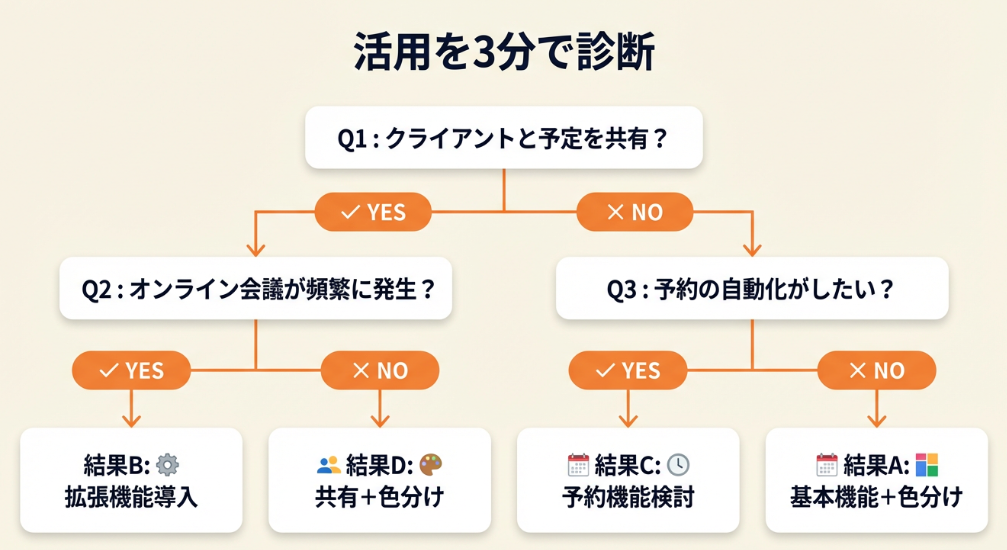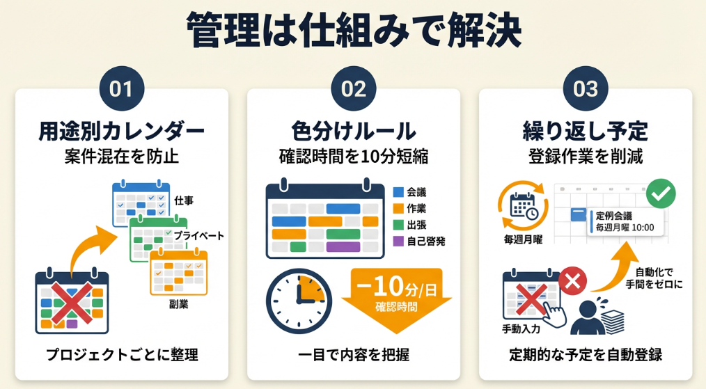 最も重要なのは「仕組み化」です。毎回手動で管理するのではなく、一度ルールを決めて自動化することで、スケジュール管理のストレスから解放されます。まずは「仕事用」と「プライベート用」の2つのカレンダーを作成し、色分けルールを設計するところから始めてください。