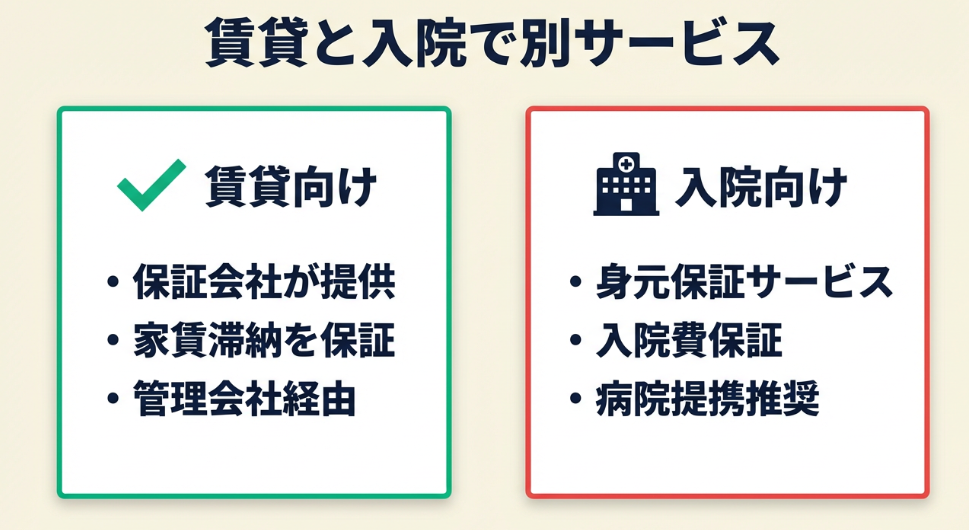 賃貸と入院では利用するサービスが異なります。この違いを把握していないと、いざというときに手続きが遅れる可能性があります。用途別の違いを整理します。