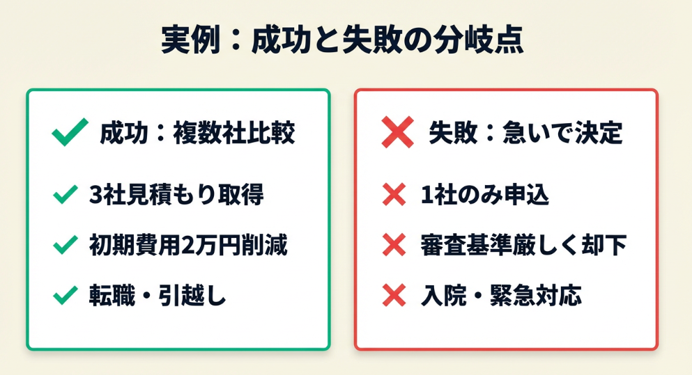 結果: 3社の中で最も費用が安いサービスを選び、初期費用を2万円抑えることができた。
