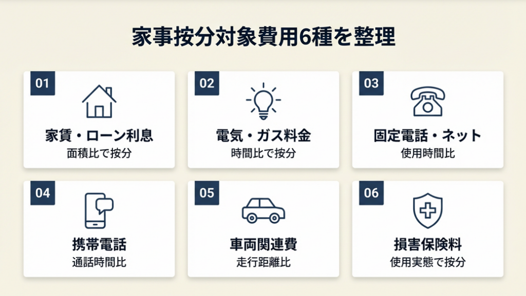 | どの費用が対象か確認したい | 家事按分の対象費用は6種で整理 | 3分 |