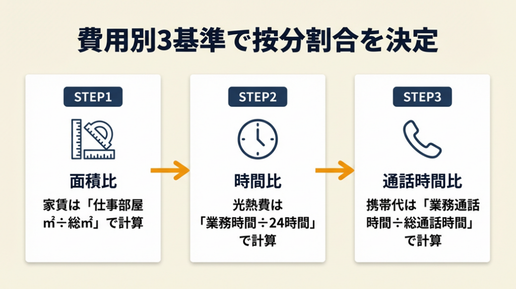 家賃は面積比、光熱費は時間比、携帯代は通話記録比でそれぞれ算出し、費用別に根拠を明記した記録を月次で保存してください。