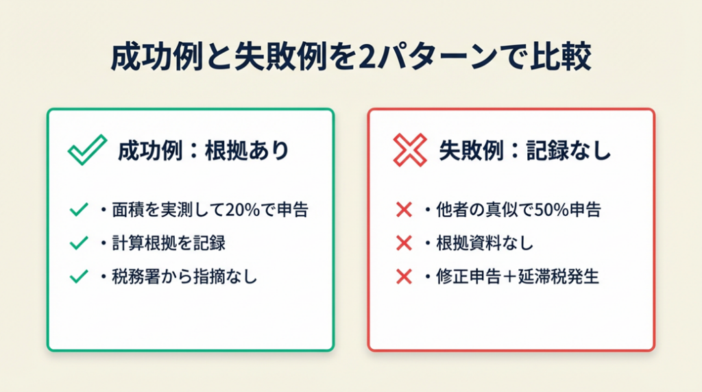 Aさんが根拠を記録せずに「とりあえず30%」で申告していれば、税務調査時に合理的説明ができず修正申告を求められた可能性があります。