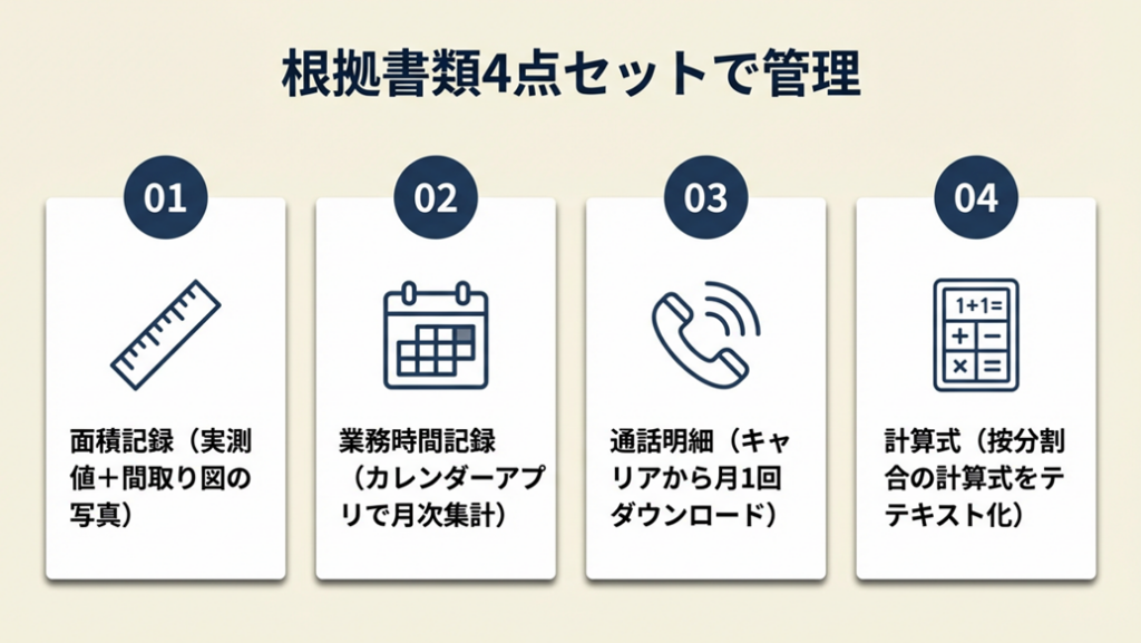-> 面積記録・業務時間記録・通話明細・計算式の4点セットがそろっているか確認し、不足している書類を今月中に準備する(30分)