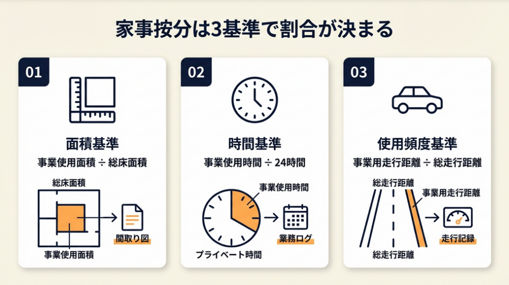 代表的な按分基準は次の3種類です。面積基準は「事業使用面積 ÷ 総床面積」で計算し、自宅兼事務所の家賃・光熱費に広く使われます。時間基準は「1日の事業使用時間 ÷ 24時間」または「月の事業稼働日数 ÷ 月の総日数」で算定し、通信費やサブスクリプション費用に適しています。使用頻度基準は「事業用走行距離 ÷ 総走行距離」が代表例で、自動車費用の按分に用います。
