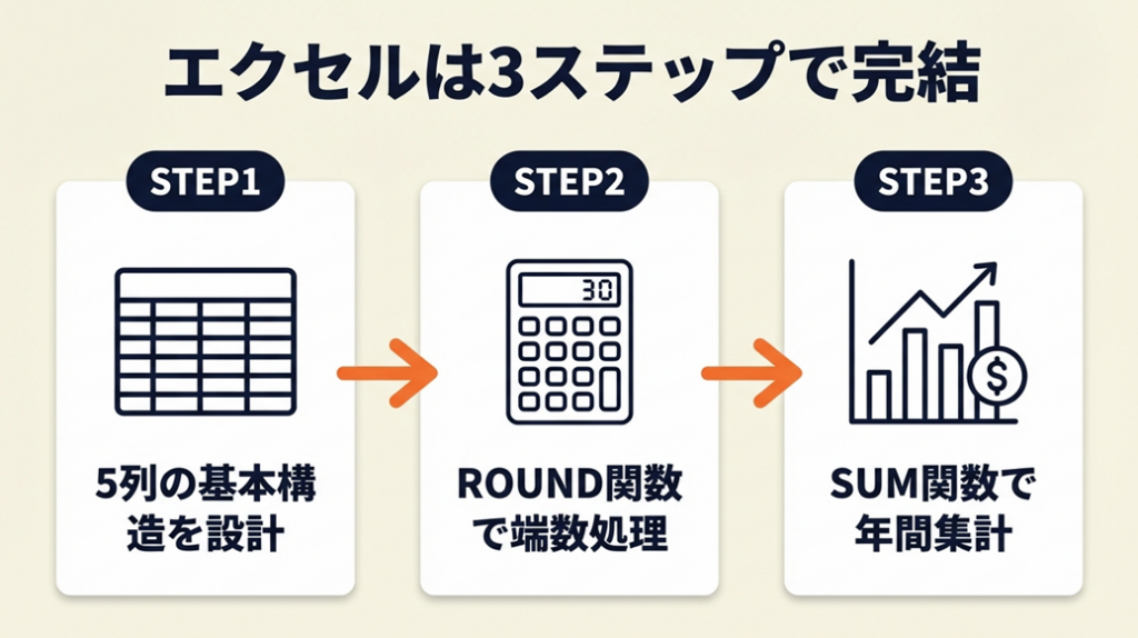 最初からROUND関数を全列に適用していれば、合計不一致のトラブル自体が発生しませんでした。端数処理は確定申告書との数値整合性に直結するため、表作成の最初の段階で設定してください。