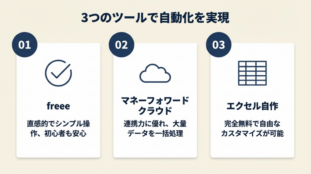 | 向いているケース | 取引が少ない・シンプル重視 | 口座連携が多い・一括処理 | コスト重視・カスタム設定 |