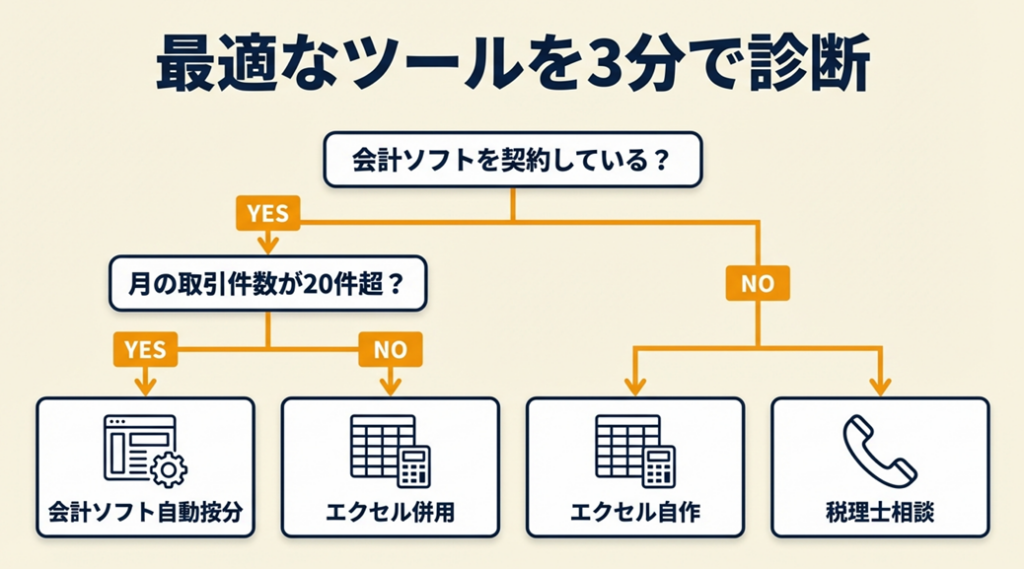 取引件数が少ない場合は、会計ソフトでの按分設定に加えてエクセルで按分率の根拠資料を管理する併用型が適しています。証拠資料の整備を優先してください。