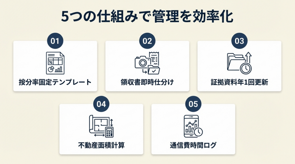 按分計算は月次で継続する仕組みを作ることが重要です。以下の5つのハックを導入することで、確定申告直前の作業を年間で約10時間削減できます。