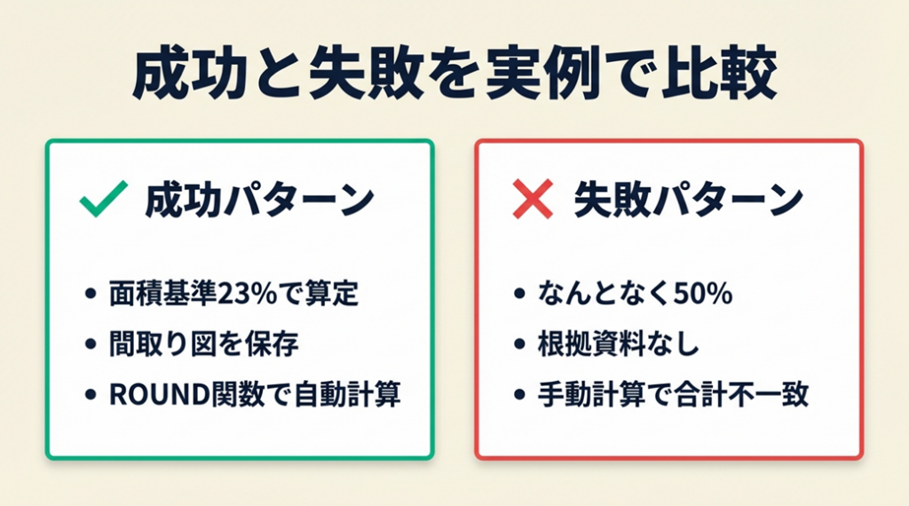 - 【なぜ効くのか】: 面積は客観的に測定できる数値であるため、税務署への説明がシンプルです(第1段階)。主観的な「使用感」での按分は担当者の解釈に依存するため交渉が必要になります(第2段階)。客観的数値があれば交渉コストがゼロになり、修正申告リスクも最小化されます(第3段階)。