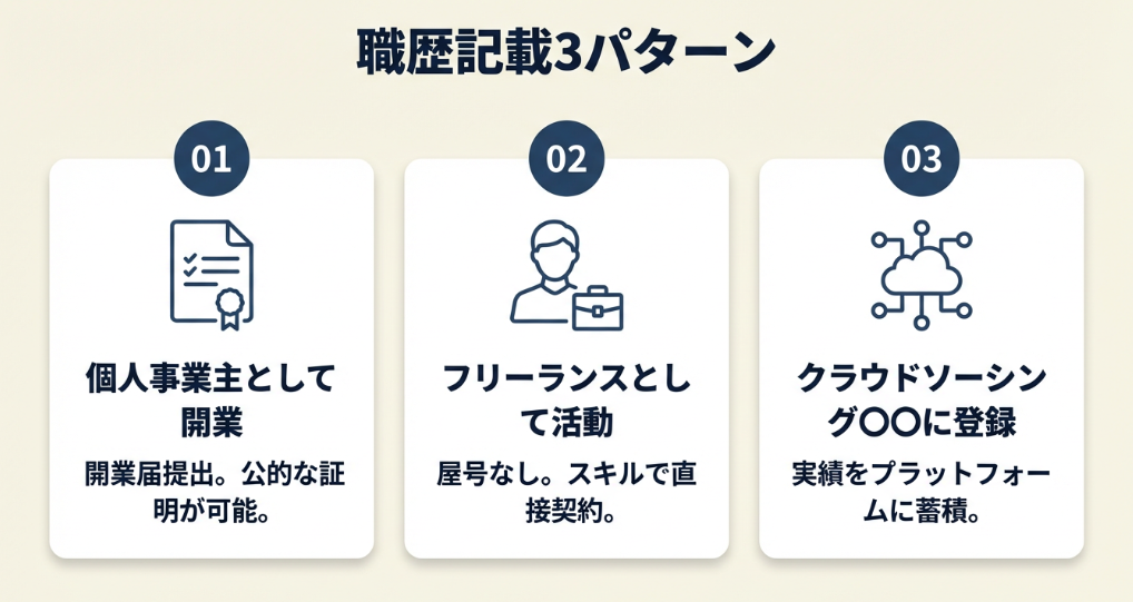 フリーランスや個人事業主としての活動期間は、正社員経験と同様に職歴として記載できます。開業届の有無や主な受注経路によって書き方が異なるため、自分に合ったパターンを選んでください。