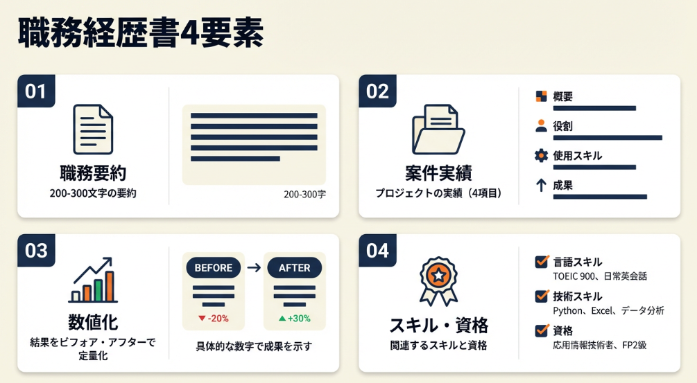・職務要約は200-300文字、案件実績は4項目で構成する