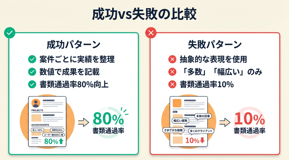 1案件あたり5行で「概要・担当・スキル・成果」が伝わり、再現性のある実力を証明できる