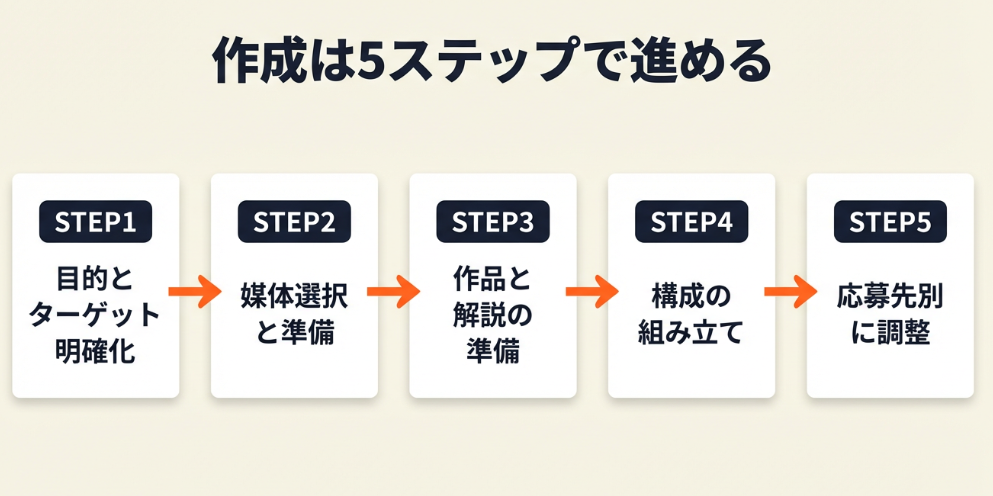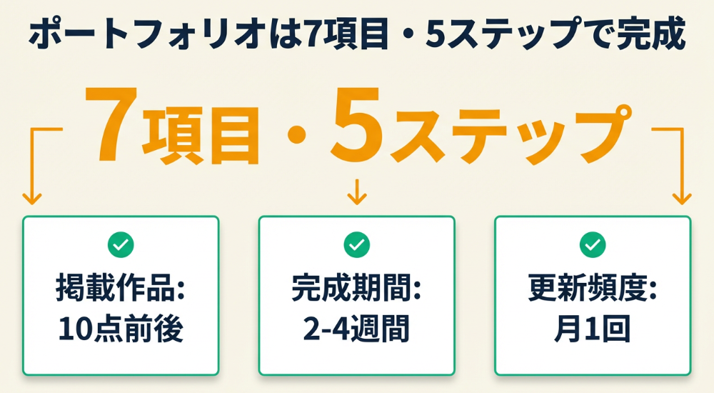 ポートフォリオは7項目(目次・プロフィール・作品一覧・各作品の詳細・スキル・実績・連絡先)で構成し、5ステップ(目的設定→媒体選択→素材準備→制作→調整)で作成すれば、未経験でも案件獲得につながる品質に仕上がります。