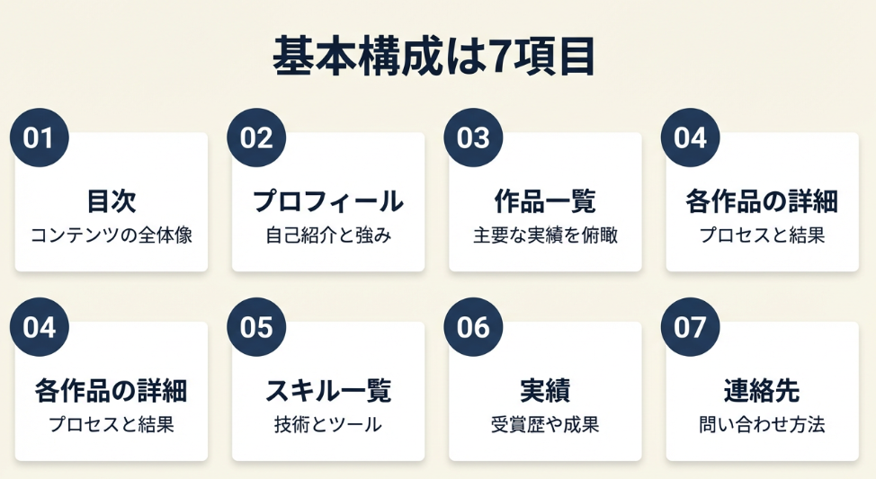 私自身、最初は何から手をつけていいか見当もつきませんでした。でも、基本構成は7項目に整理でき、この構成を押さえれば採用担当者やクライアントが求める情報を網羅できます。