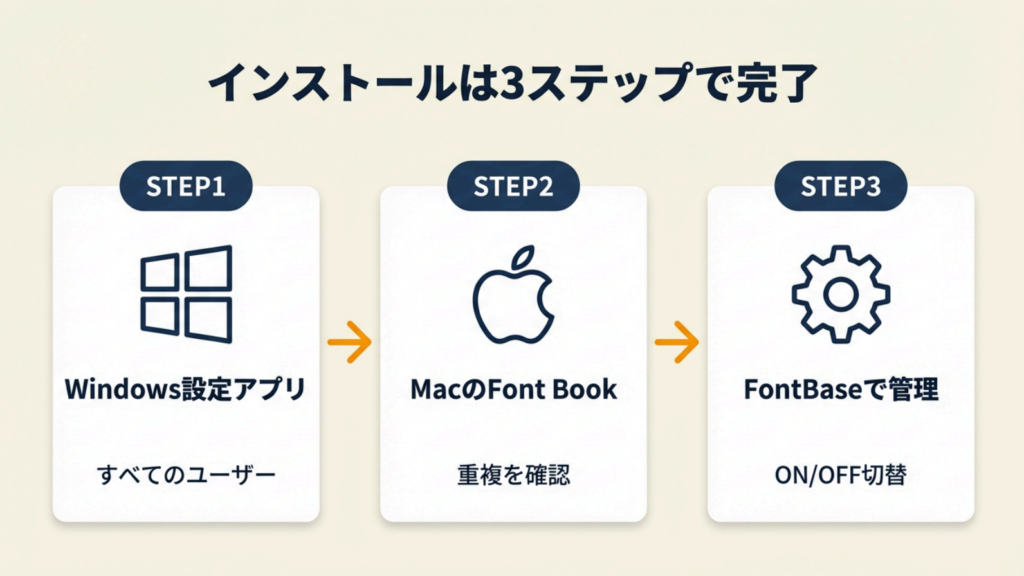 インストール後に「フォントが表示されない」「アプリ内で選べない」と焦る場面があります。手順を体系化しておくと、次回以降は5分以内で完了します。