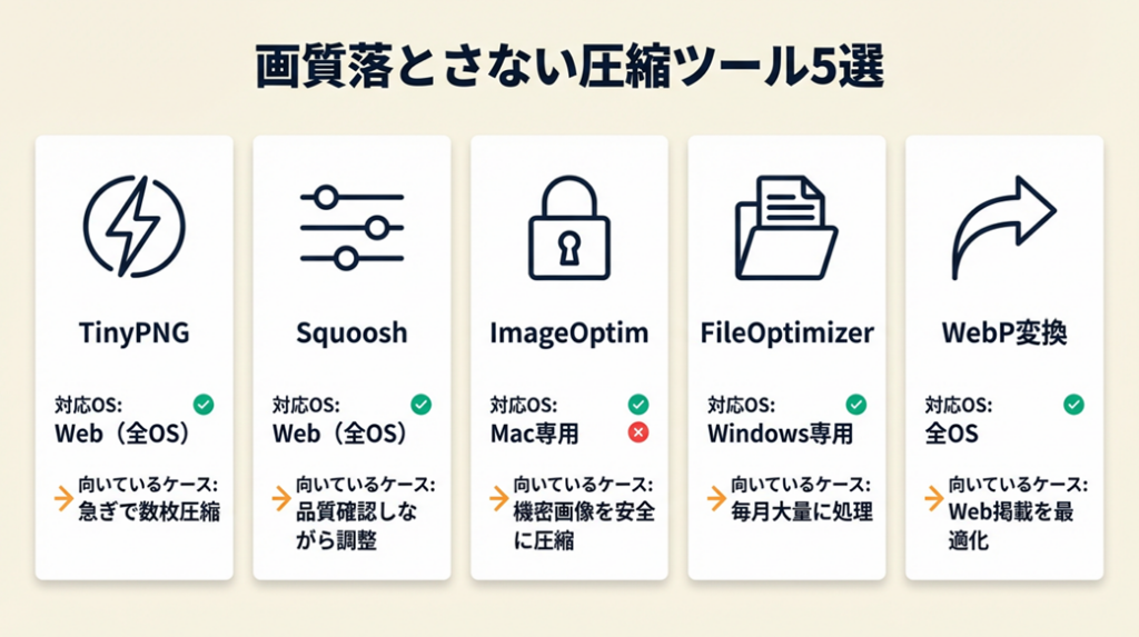 | TinyPNG | Web(全OS) | 少量の素早い圧縮 | 急ぎで数枚圧縮したい |