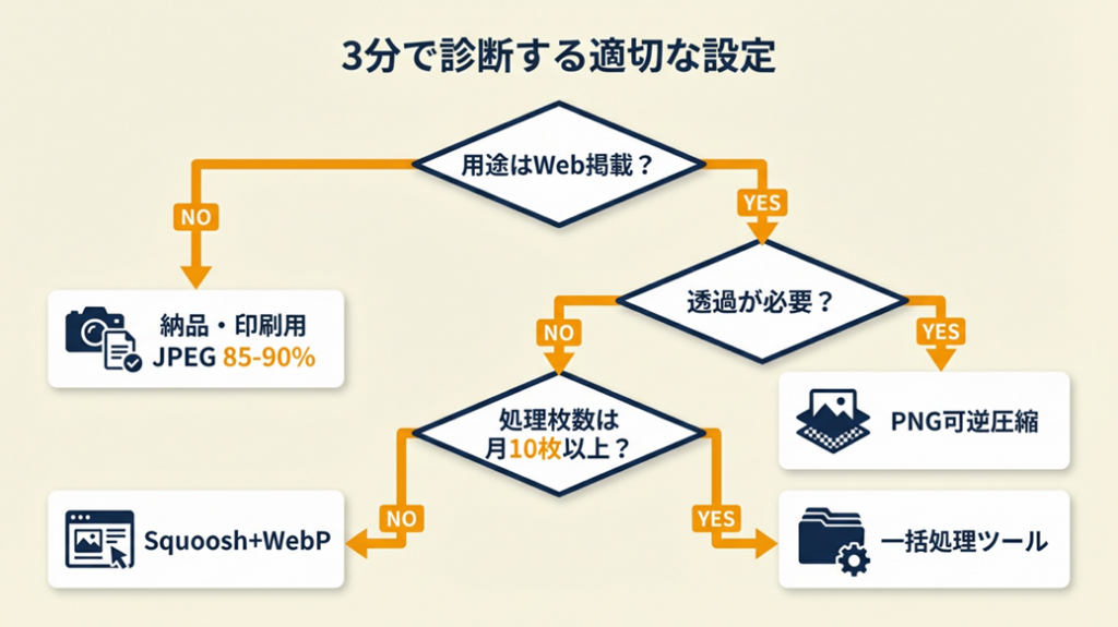 「自分の状況に合った圧縮設定はどれか」を迷う方向けに、3分で判断できる診断フローを用意しました。