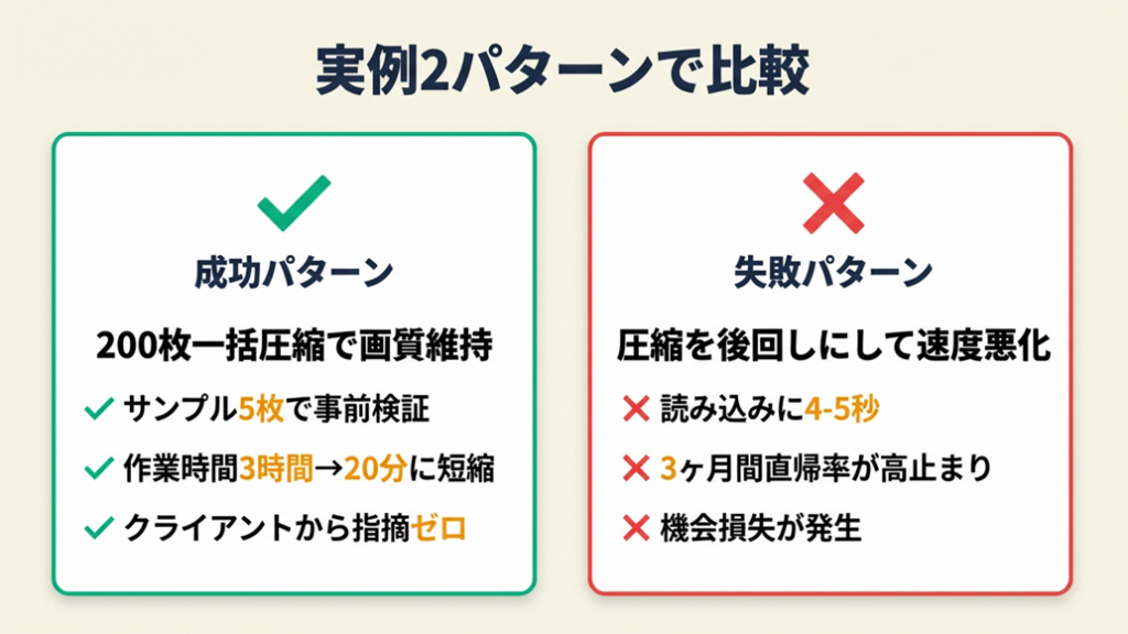 リニューアル時点で圧縮処理を実施していれば、3ヶ月分の機会損失(離脱ユーザーの流出)を防げた可能性があります。「後でやる」が高コストな判断です。