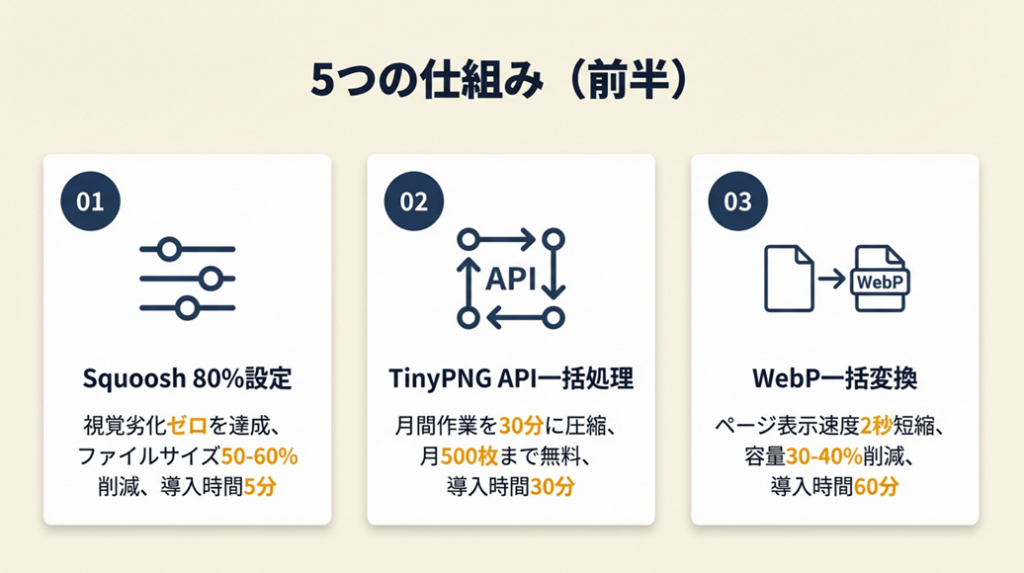 - 【最初の一歩】: tinypng.comでAPIキーを取得し、テスト用の画像10枚で一括処理を試す(30分)