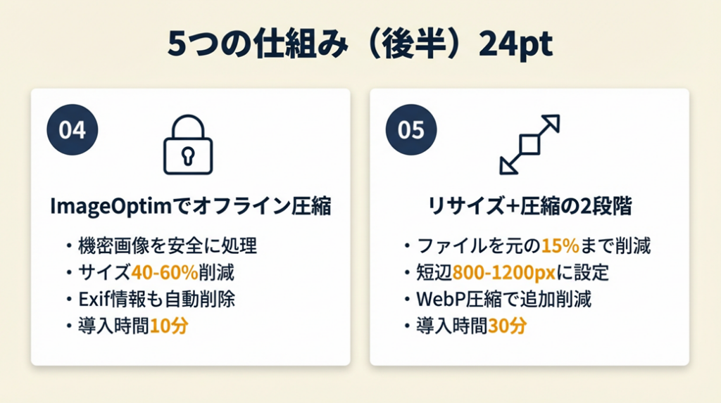 - 【効果】: リサイズ(短辺800〜1,200px)+WebP圧縮の2段階処理でファイルを元の10〜15%まで削減(例: 6MB → 600KB〜900KB)