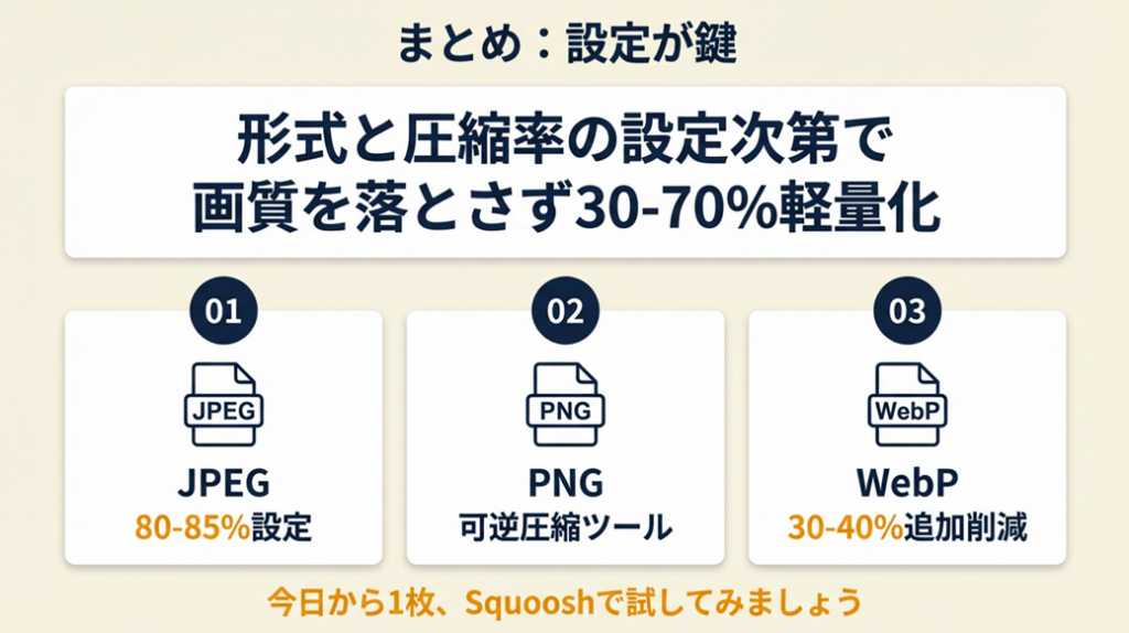 形式と圧縮率の設定次第で、画質を落とさずに30〜70%の軽量化が実現できます。JPEGは80〜85%、PNGは可逆圧縮ツール、WebPへの変換という3つの選択肢を用途別に使い分けることで、どんな場面でも画質トラブルなく最適化できます。今日から1枚だけSquooshで試せば、その効果はすぐに体感できます。