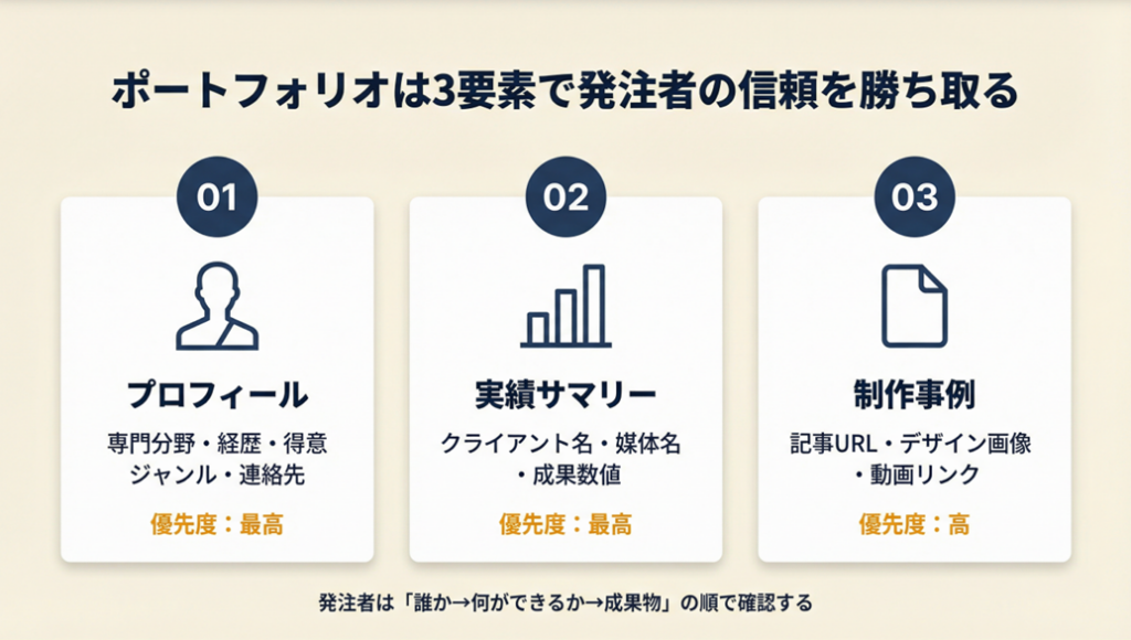 この順番には理由があります。発注者は「誰か」→「何ができるか」→「実際の成果物」の順で確認するため、プロフィールを最初に置くことで離脱を防げます。逆に制作事例から始めると、文脈なしに作品を見せることになり、判断材料として機能しにくくなります。