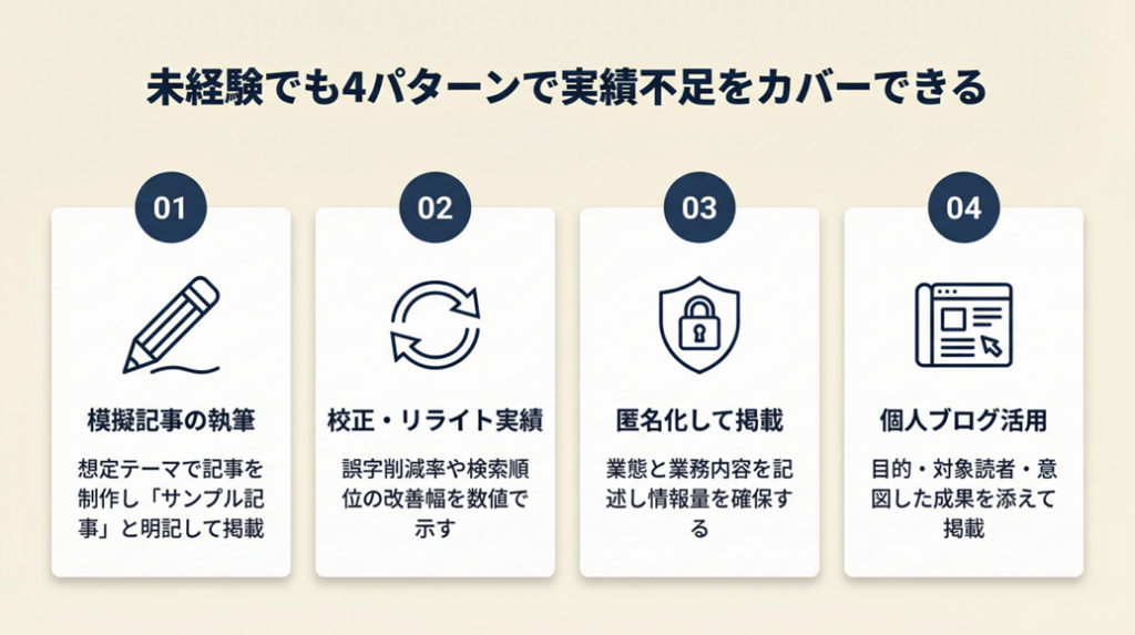 実績は「案件をこなした証明」だけに限る必要はありません。発注者が確認したいのは「この人はアウトプットを出せるか」であり、方法は複数あります。