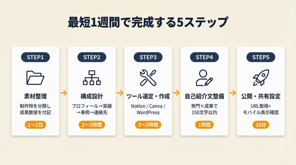 「どこから手をつければいいか分からない」という悩みは自然なことです。以下の5ステップに沿って進めると、最短1週間でポートフォリオを公開できます。