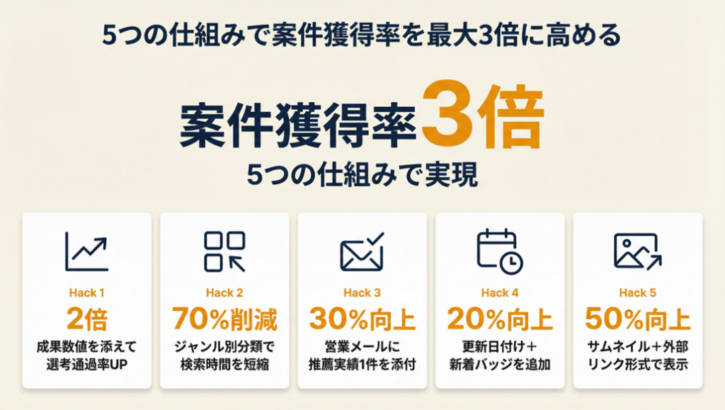 実績を並べるだけで終わっているポートフォリオは、発注者の意思決定を助けられていません。案件獲得率を高めるには、以下の5つの仕組みを組み込む必要があります。