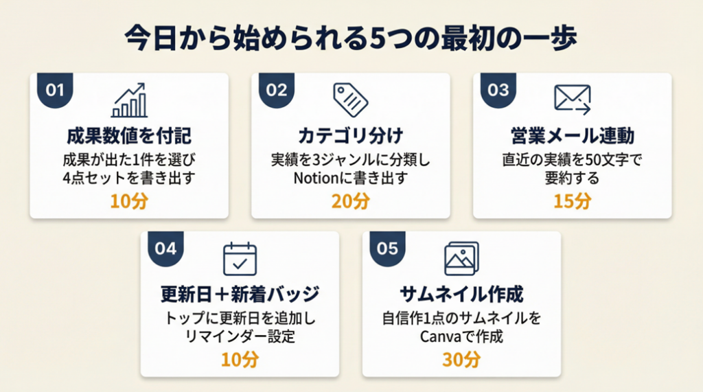 -> 自分の現状(実績件数・数値有無)を確認し、上記のStep 1〜5のうち今日から着手できるステップを1つ決める(5分)