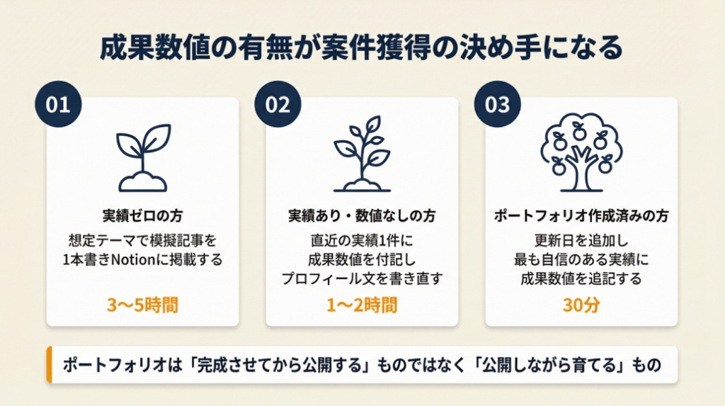 ポートフォリオは「完成させてから公開する」ものではなく、「公開しながら育てる」ものです。まず1件の実績を成果数値付きで掲載し、URLを1社に送ることから始めてください。最初の問い合わせが来たとき、あなたのポートフォリオはすでに「育ち始めている」状態になっています。
