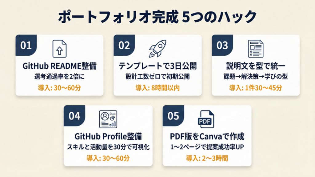 [なぜ効くのか]: テンプレートを使うことで「デザインの意思決定コスト」を削減できます。次に、その削減した時間を実績説明文の質向上に使うことで、ポートフォリオ全体の価値が高まります。さらに根本的には、採用担当者はデザインより「情報の整理度とコンテンツの質」を優先して評価するため、テンプレートでも十分な評価を得られる構造になっています。