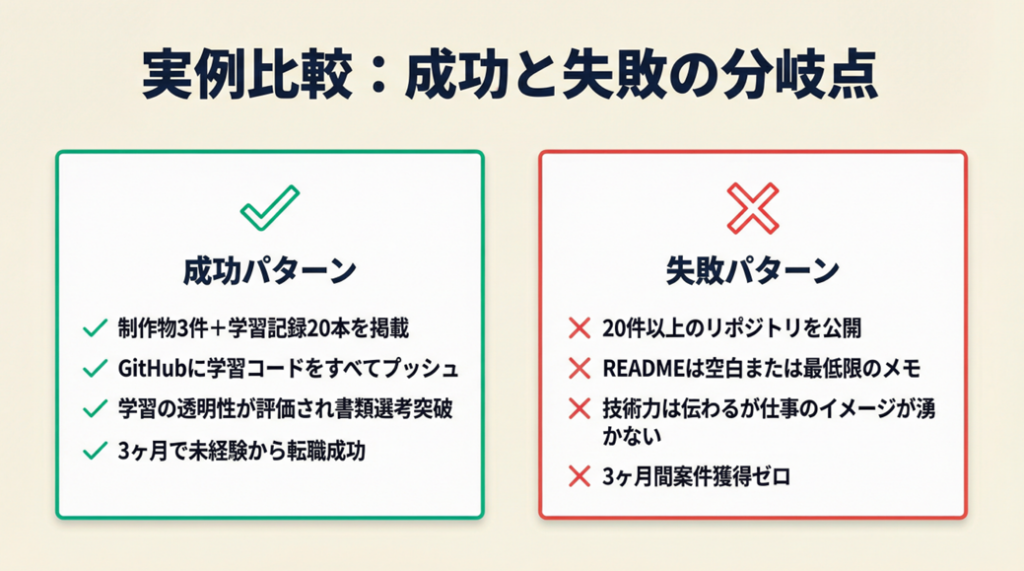 もし学習記録を非公開のまま完成度の高い作品だけを掲載していれば、学習姿勢が伝わらず選考通過できなかった可能性があります。この事例から学べることは、「完成品の完璧さより学習プロセスの透明性が転職市場では評価される」という点です。