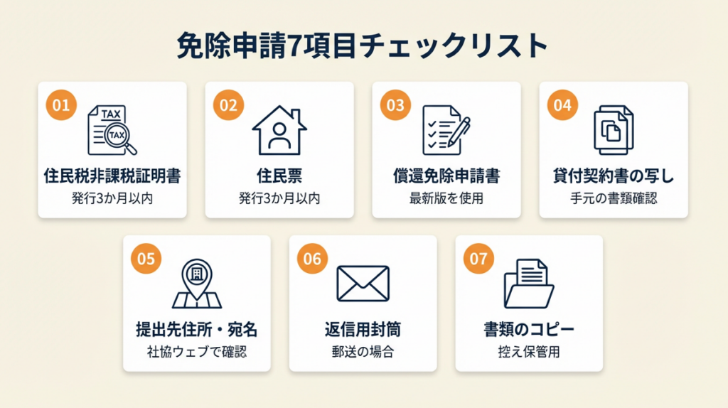 償還免除申請に必要な基本書類は以下の4種類です。①償還免除申請書(都道府県社協の窓口またはウェブサイトで入手)、②住民税非課税証明書(市区町村役場・コンビニ交付で取得)、③住民票(発行から3か月以内のもの)、④貸付契約書の写しです。