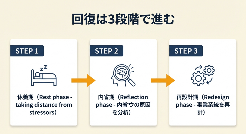第1段階はストレス源から距離を置く「休養期」、第2段階は燃え尽きた原因を整理する「内省期」、第3段階は働き方の仕組みを再構築する「再設計期」です。第1段階(休む)を飛ばして第3段階(仕組み作り)を急ぐことが、再発の最大の原因になります。