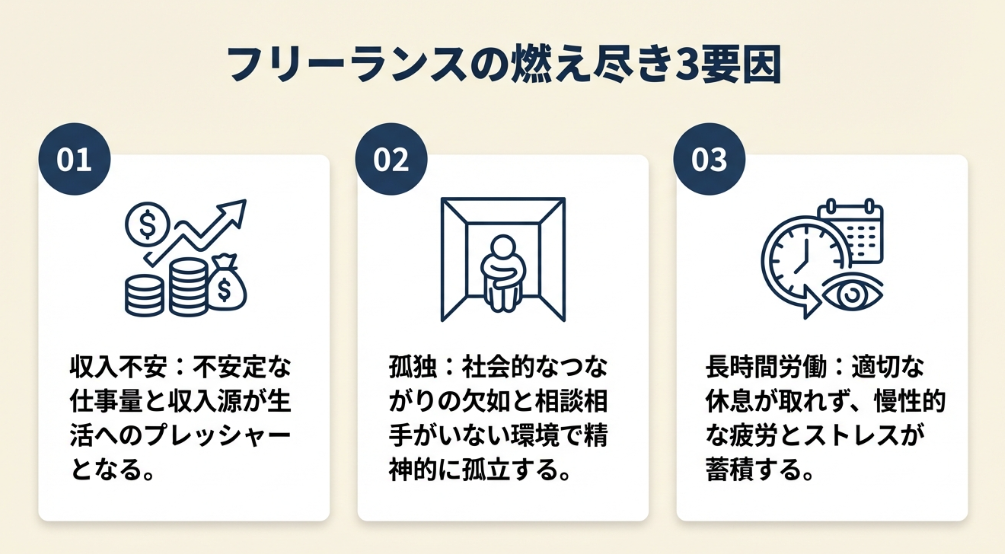 フリーランスの燃え尽きを引き起こす要因は、「収入の不安定さ」「孤立した労働環境」「長時間労働と責任の集中」の3つが同時に発生する点にあります。会社員であれば給与は保障され、チームメンバーとの協働があり、休みを取っても仕事は誰かが引き継ぎます。フリーランスは、休めば即収入ゼロ、相談相手もおらず、すべての責任を一人で抱えます。この3つが重なったとき、燃え尽きは急速に進みます。見落としがちな点として、在宅ワーク特有の「仕事とプライベートの境界の消失」も重大な要因です。