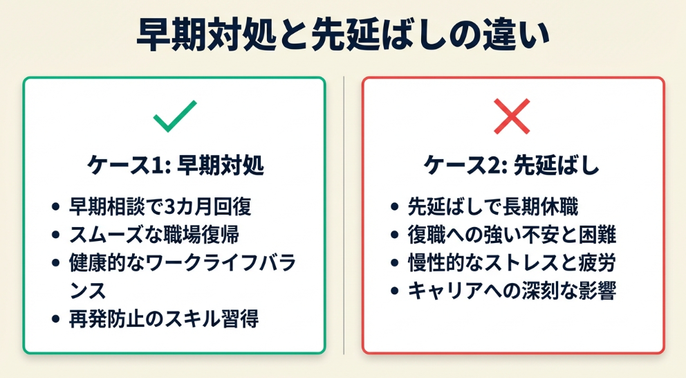 実際の体験談をもとに、早期対処した場合と先延ばしにした場合を比較します。