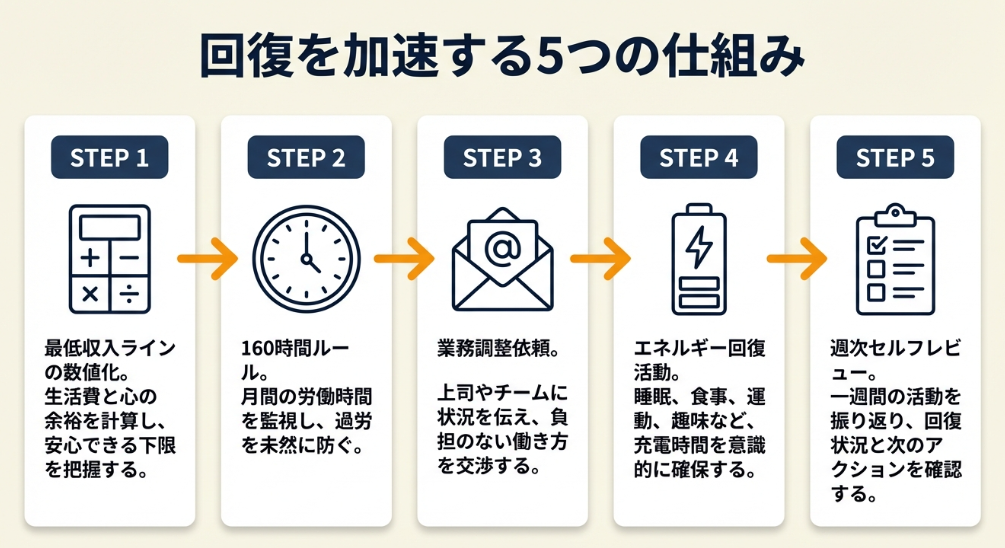 回復は「休む→見直す→仕組みを作る」の順で進む