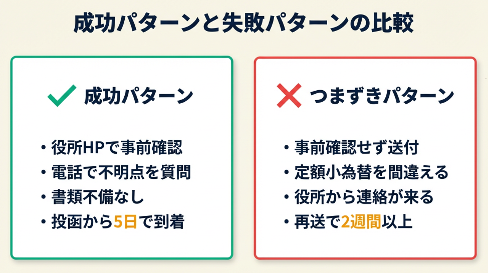 郵送請求で「うまくいくパターン」と「つまずくパターン」を比較します。