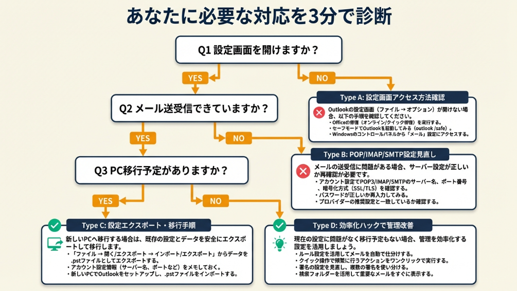 | 自分に合う設定方法を知りたい | Outlook設定の対応を3分で診断 | 3分 |