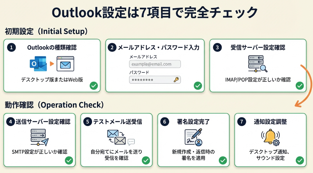 | 設定項目を確認したい | Outlook設定は7項目でチェック | 5分 |