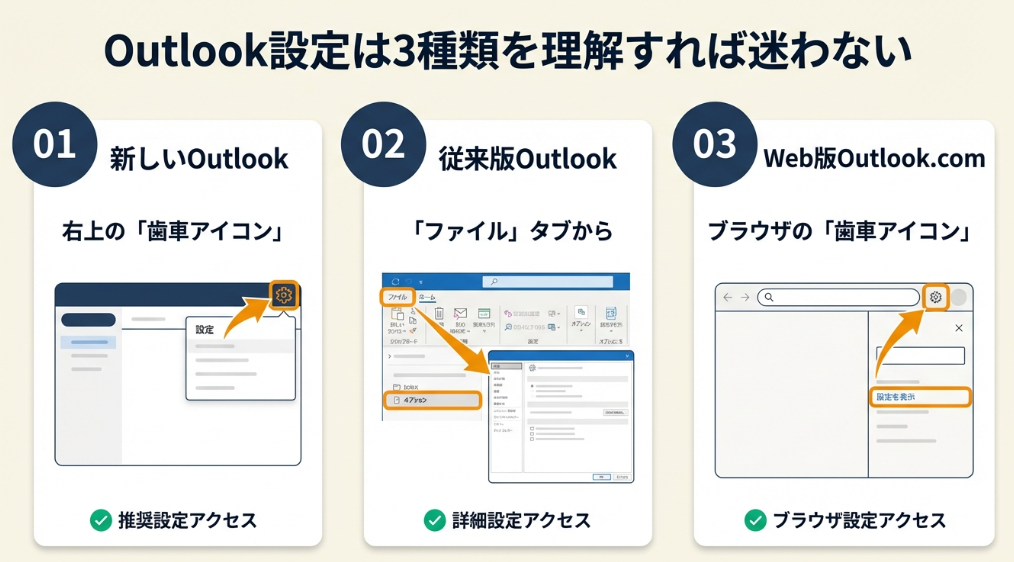 Outlookには複数の種類があり、それぞれ設定画面の場所が異なります。「新しいOutlook」「従来版」「Web版」の3つを押さえておけば、どのバージョンでも迷いません。
