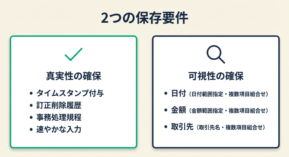 保存要件は「真実性の確保」と「可視性の確保」の2つです。真実性はタイムスタンプまたは事務処理規程で、可視性はファイル名に日付・金額・取引先を含めることで対応できます。無料アプリと事務処理規程の組み合わせで、コストゼロで法律に準拠した電子保存が可能です。
