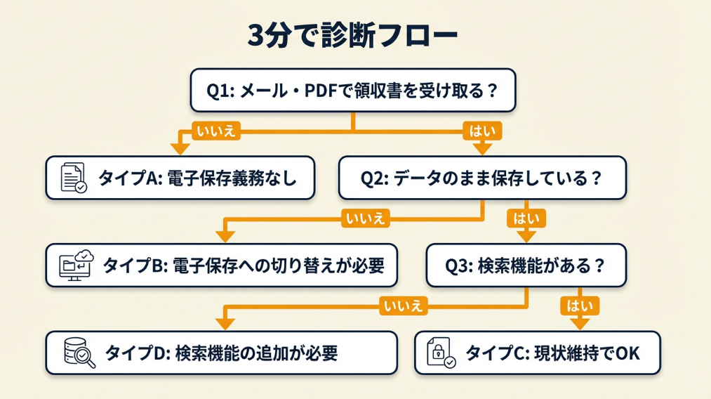 | 自分が対象か知りたい | 領収書電子保存の対応を3分で診断 | 3分 |